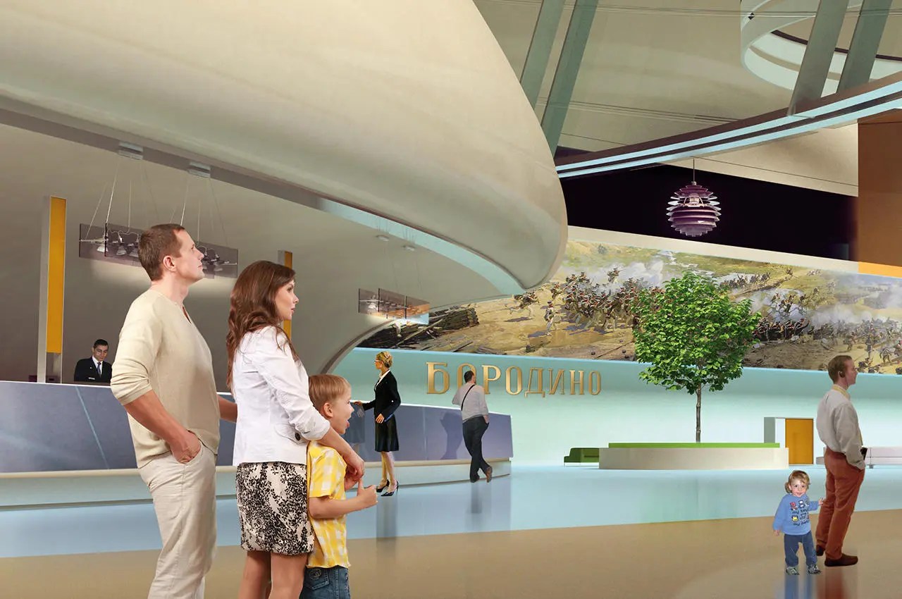 По заказу Правительства Московской области нами был разработан начальный концепт музейно-исторического комплекса «Бородино». Целями проекта были создание туристского объекта нового типа, центра развития исторической науки, места образования и патриотического воспитания молодежи. Согласно техническому заданию Комплекс должен был включать в себя зону основной экспозиции под открытым небом, крытую экспозиционную зону «живой музей», улицу ремесел, международный научный и культурный центр, зону военно-исторических реконструкций, обзорный кинотеатр и другие объекты, а также монорельсовую дорогу, идущую над всей открытой частью экспозиции. Архитектурные очертания комплекса напоминают большой барабан, колесо старинной пушки, с самого входа настраивая посетителей на соответствующий лад, приглашая их в увлекательное путешествие по страницам истории. По нашему замыслу по выходным дням на открытой арене должно разворачиваться большое костюмированное историческое шоу с участием артистов, каскадеров, наездников.